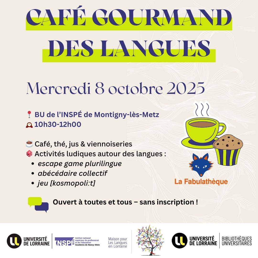 La Maison pour les Langues en Lorraine (M3L), en collaboration avec la BU de l’INSPÉ de Montigny-lès-Metz et la Fabulathèque, organise un Café gourmand des langues le mercredi 8 octobre 2025, de 10h30 à 12h, à la BU de Montigny-lès-Metz.