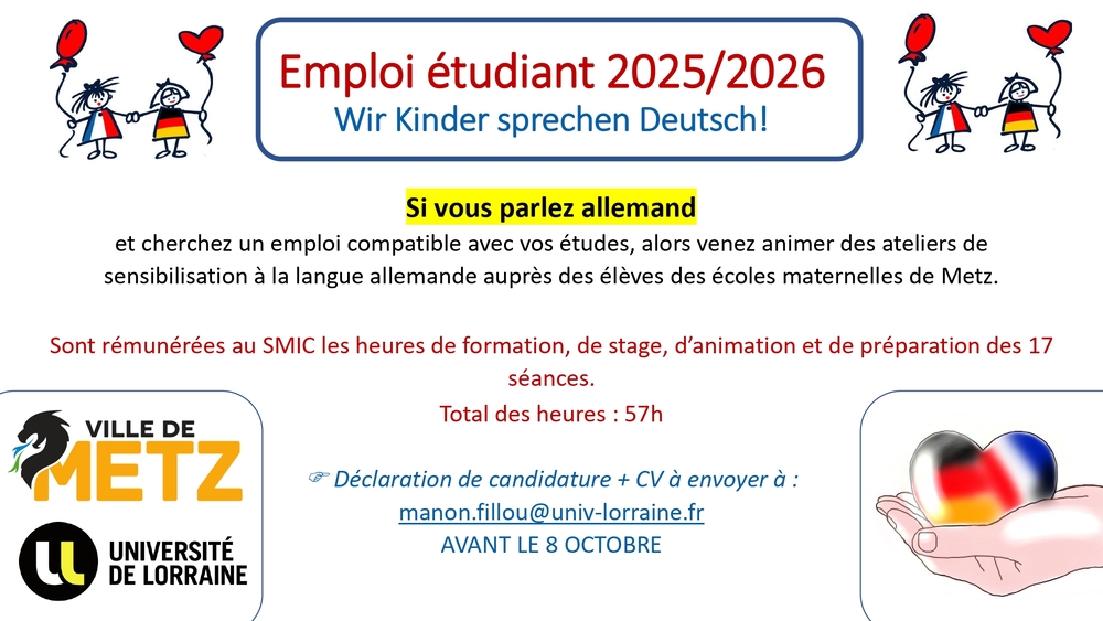 Emploi étudiant 2025-2026 : ateliers d’allemand en maternelle à Metz